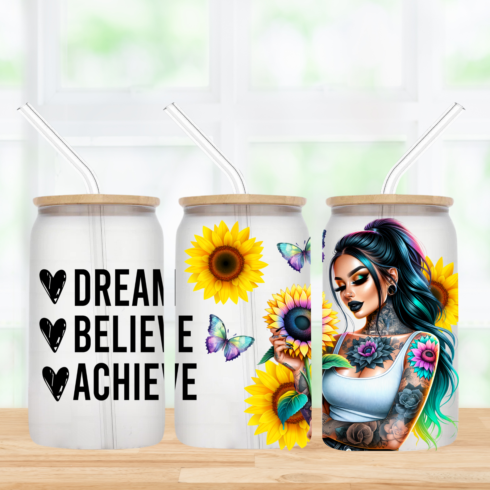 Dream, Believe, Achieve 16oz Frosted Glass Can Tumbler