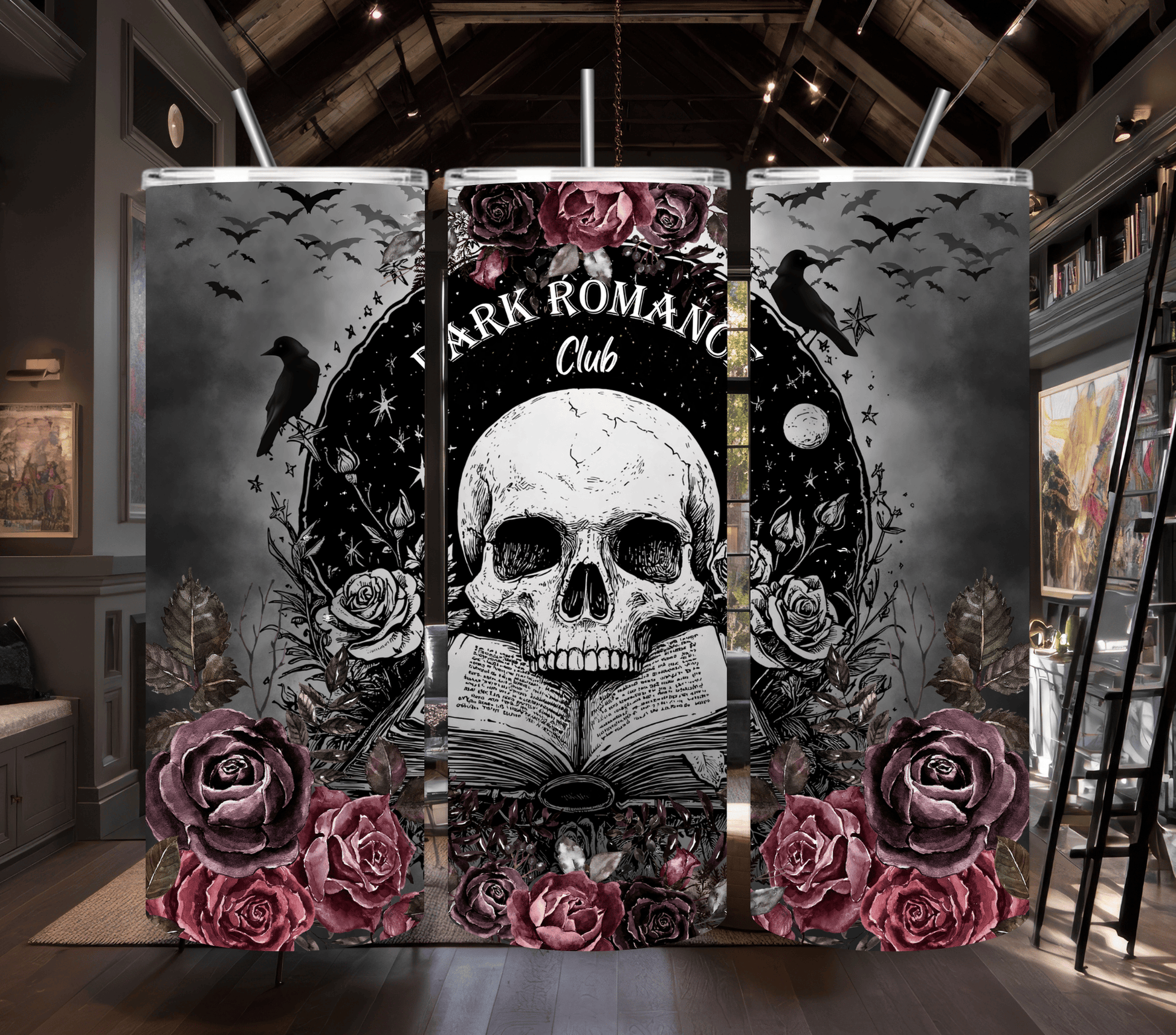 • 💀 Centerpiece Tumbler: A skull rests atop an open book beneath a starry sky, crowned by roses and framed by the words “DARK ROMANCE Club.” It’s a shrine to smut, sorrow, and stories that bite back.