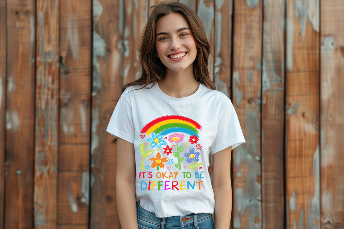 Spread positivity and celebrate individuality with this heartwarming white t-shirt! Featuring a bold and cheerful design, it includes a colorful rainbow arching over a vibrant array of flowers and hearts. At the center of the artwork, the uplifting message "IT'S OKAY TO BE DIFFERENT" stands out, with "DIFFERENT" displayed in vibrant multicolored letters, emphasizing the beauty of diversity and inclusivity.