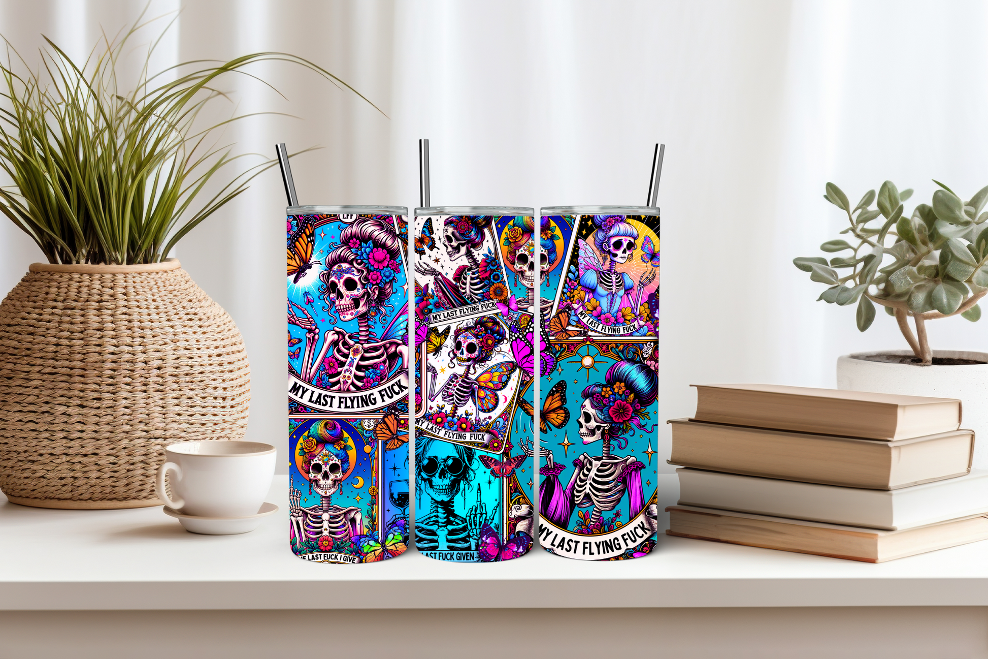◦ Slogan: “MY LAST FLYING FUCK” elegantly scattered across each tumbler in bold, rebellious script