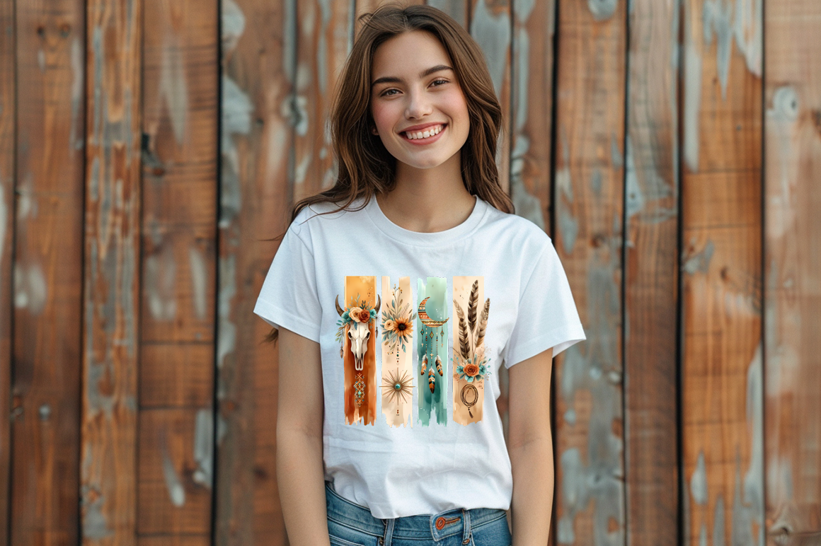 Embrace bohemian charm with this unique white t-shirt, showcasing a stunning four-panel design that celebrates Southwestern and earthy aesthetics. Each vertical panel features intricate, artistic illustrations:
